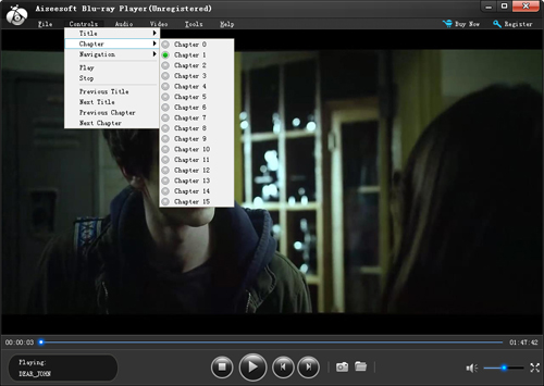 Click the "Controls" opreation, and then you will see the column list. here you can choose your preferred title/chapter to watch first, and choose previous or next title/chapter for playback.